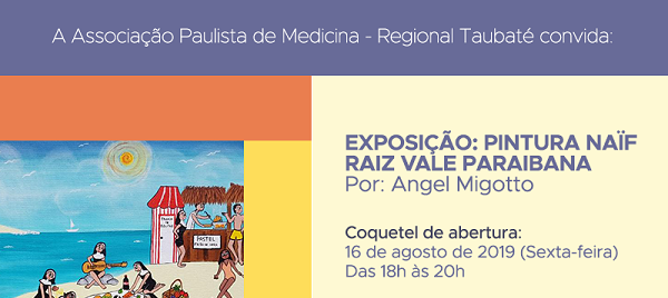 Marcando a abertura da exposição “Pintura Naïf Raiz Vale Paraibana” a Regional da Associação Paulista de Medicina de Taubaté convida seus associados e familiares a participarem de um coquetel na próxima sexta (16), das 18h às 20h.