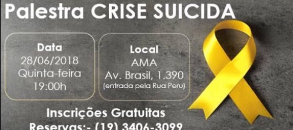 A Sociedade Médica de Americana, Regional da Associação Paulista de Medicina, realizará, em 28 de junho, às 19h, a palestra “Crise Suicida”, que abordará temas como comportamentos suicidas, atitudes em relação ao suicídio, características pessoais e circunstâncias, estimativa dos ricos e relação empreendida com paciente e família.