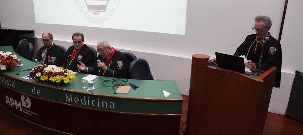 O vice-presidente da APM, Akira Ishida, abriu a mesa – acompanhado pelos confrades José Luiz Gomes do Amaral, presidente da APM e da AMSP, e Paulo Manuel Pêgo Fernandes, delegado da APM – dizendo que é uma honra e satisfação da Associação receber a solenidade. “Além do mais, é uma obrigação. Isso porque a Academia tinha atividade voltada para educação continuada e pesquisa, mas com um número limitado de pessoas. Assim, nasceu a APM, contemplando os médicos paulistas com essa e outras missões, como a defesa profissional”, afirmou Ishida.