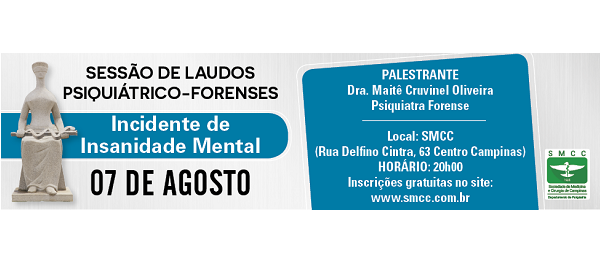 A Sociedade de Medicina e Cirurgia de Campinas (SMCC), Regional da APM, organiza a palestra de Maitê Cruvinel, psiquiatra forense, sobre Incidente de Insanidade Mental, na próxima segunda-feira (7).