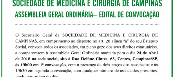 O secretário-geral da Sociedade de Medicina e Cirurgia de Campinas, Regional da APM, convoca todos os associados a comparecerem à Assembleia Geral Ordinária marcada para esta terça-feira, 24 de abril.