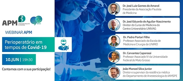O perioperatório durante a pandemia de COVID-19 é tema do próximo Webinar da Associação Paulista de Medicina (APM), em 10 de junho, às 19h30, pelo canal no YouTube. Por que se deve operar somente o essencial na pandemia? Como melhorar os cuidados durante a anestesia? Quais são as melhores evidências em relação às precauções pré e pós cirurgia? Como preparar o hospital e a equipe para o retorno das operações? Esses serão os principais questionamentos discutidos na reunião.