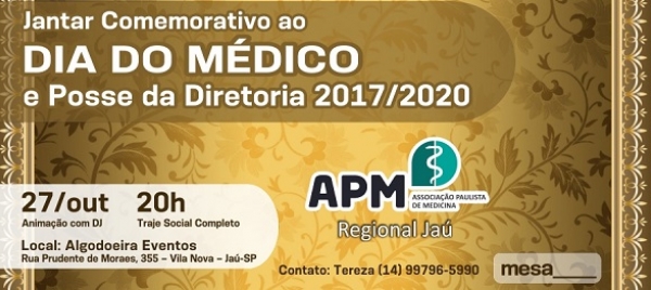 A Associação Paulista de Medicina – Jaú promove, em 27 de outubro, um jantar para celebrar o Dia do Médico e a posse da nova diretoria, na Algodoeira Eventos.