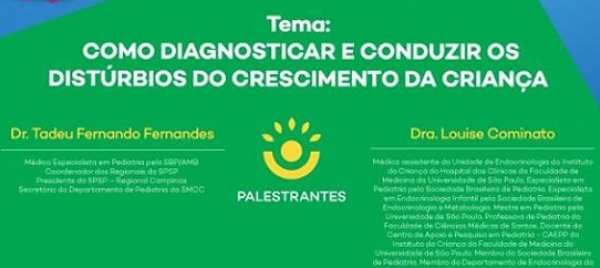 A organização é do Projeto Espichando, com apoio da Sociedade de Pediatria de São Paulo (SPSP). As palestras serão ministradas por Tadeu Fernando Fernandes, presidente da SPSP – Regional Campinas; e por Louise Caminato, especialista em Pediatria e Endocrinologia Infantil e médica da Unidade de Endocrinologia do Instituto da Criança do Hospital das Clínicas da Faculdade de Medicina da Universidade de São Paulo (FMUSP).