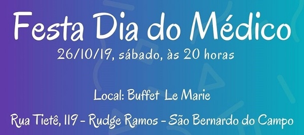A Regional da Associação Paulista de Medicina de São Bernardo do Campo e Diadema realiza no dia 26 de outubro, às 20h, a festa em comemoração ao Dia do Médico.