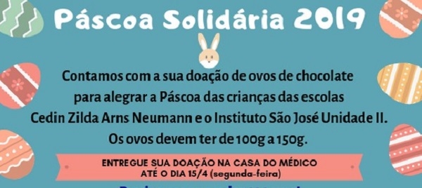 Os ovos de Páscoa devem ter de 100 a 150g e a doação pode ser levada à Regional até a próxima segunda-feira, 15 de abril. O objetivo é arrecadar cerca de 400 ovos.
