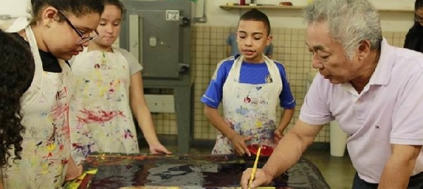 “A luz das coisas e os cenários do mundo” é o resultado de oito oficinas de arte ministradas pelo artista plástico Yugo Mabe. Nestas ocasiões, ele ensinou sua técnica e composição de cores e luminosidade – característica essencial do pintor – aos participantes do Instituto Olga Kos de Inclusão Cultural (IOK), que atende crianças e jovens com deficiência intelectual e em situação de vulnerabilidade social.