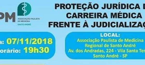 Acontece no dia 7 de novembro, a partir das 19h30, o evento “Proteção Jurídica da Carreira Médica Frente à Judicialização”, na sede da Associação Paulista de Medicina – Santo André. O evento é organizado em parceria com o escritório m.lima e com a Consultoria e Assessoria Jurídica Especializada (Cajesp).