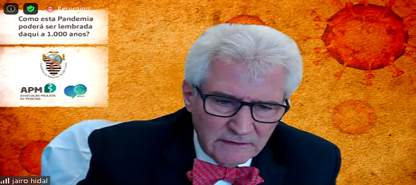 Nesta quarta-feira (10), a Tertúlia da Academia de Medicina de São Paulo voltou a ocorrer, de forma virtual, e teve Jairo Tabacow Hidal como palestrante. Hidal já foi responsável pelo núcleo brasileiro do American College of Physicians e atualmente é médico assistente da Escola Paulista de Medicina da Universidade Federal de São Paulo. Ele falou sobre o tema “Como esta pandemia poderá ser lembrada daqui a 1.000 anos?” para os mais de 70 médicos que acompanharam o tradicional evento, desta vez pela plataforma Zoom.